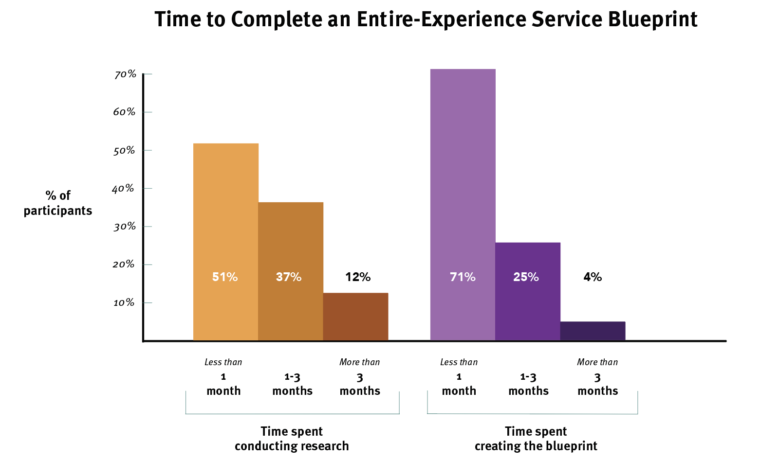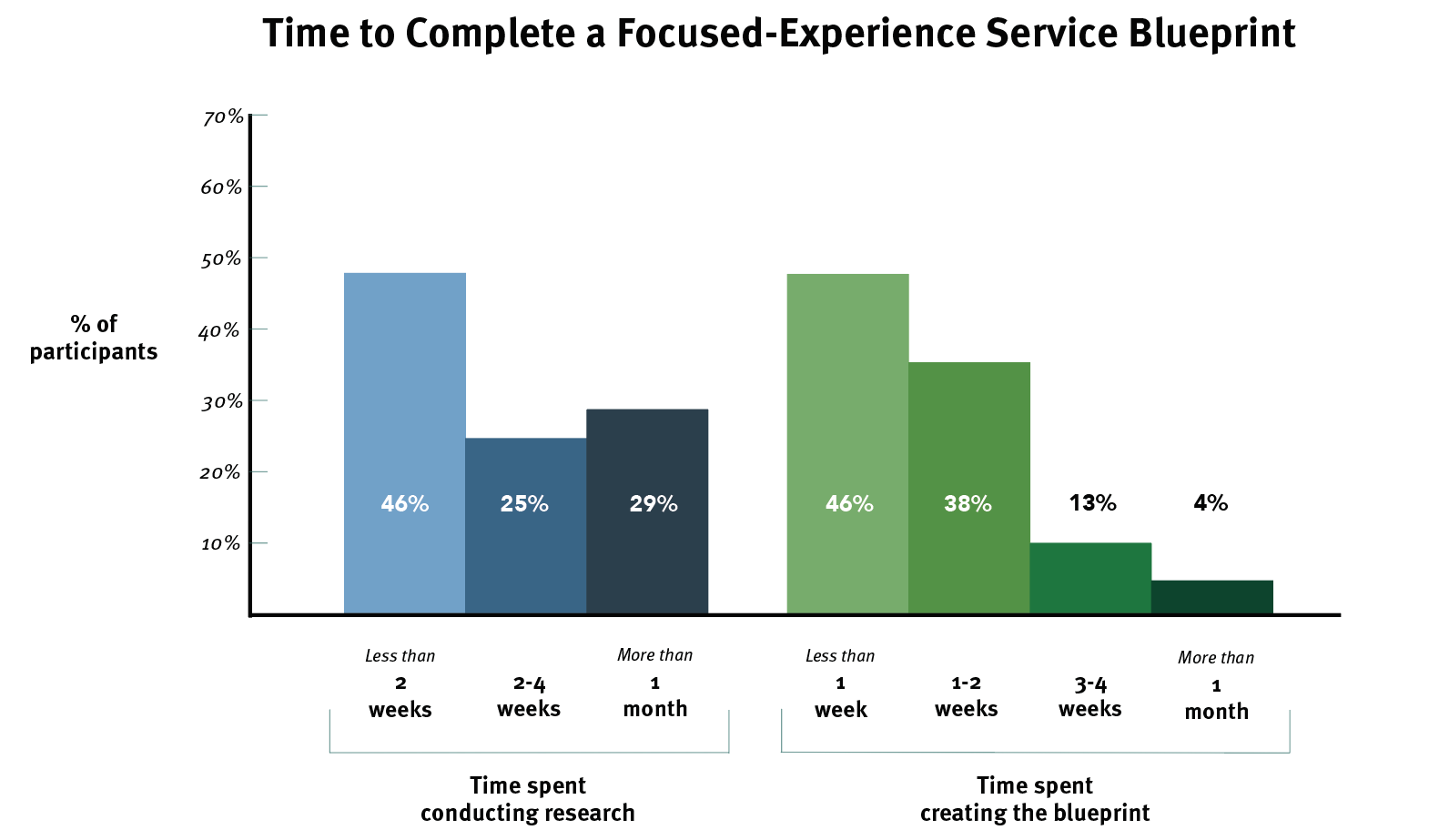 几乎有一半的团队创建了具有针对性的服务蓝图,花费了不到2周的时间进行研究,而花费不到1周的时间来创建蓝图。