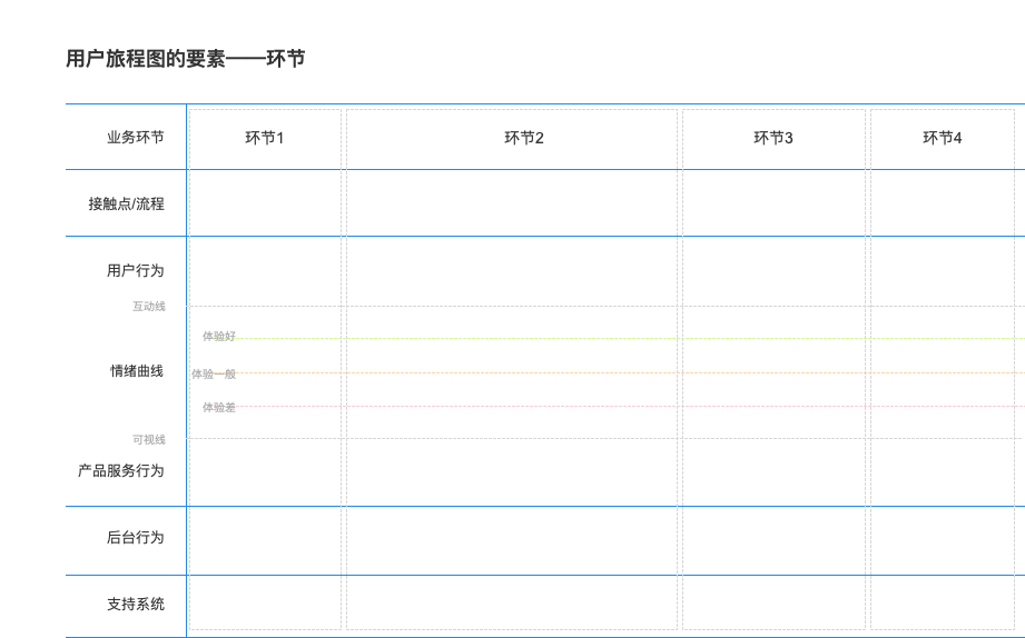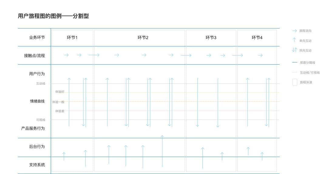 分割型图例指的是将画面划分为不同区域的线段或形状。用户旅程图在横向层面,有用户不同操作环节的划分,可以用泳道图来示意;在纵向层面,有业务、接触点、用户、产品服务、后台、支持系统等层次的划分,通过实线段来示意。