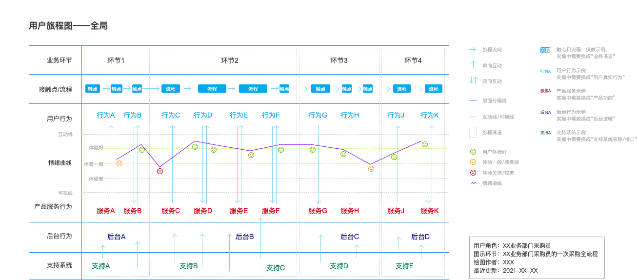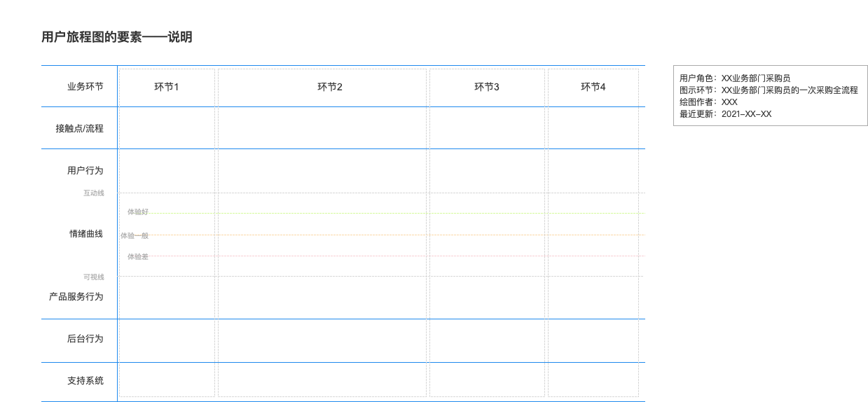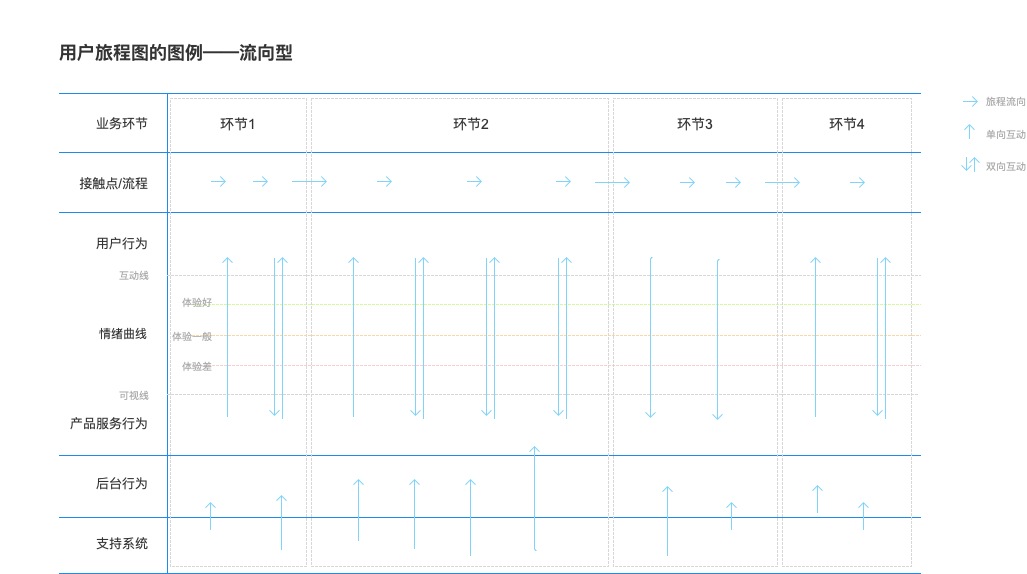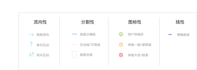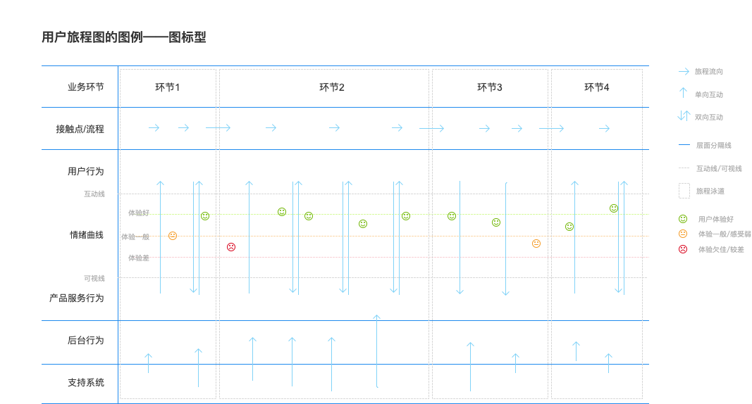 本文中的图例是指对用户旅程图中的线段、箭头、虚线、图标等符号的一种说明,目的是为了快速地帮助读者了解图形的含义。