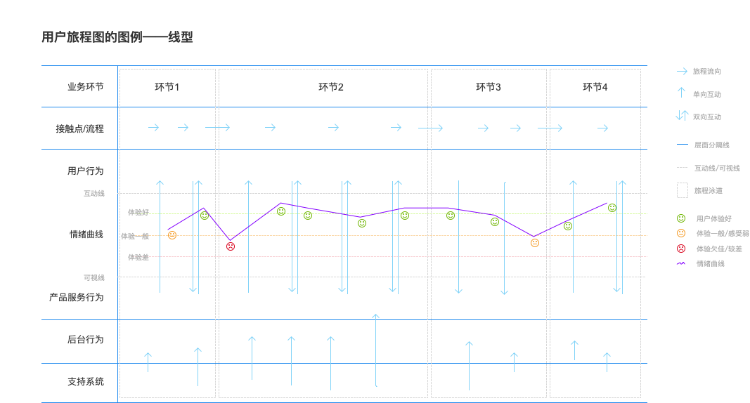 用户旅程图中的线型图例,特指情绪曲线,用一条连续的折线段表示出来,可以看到用户在整个行为流程中的情绪变化。