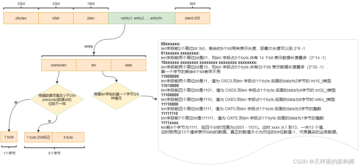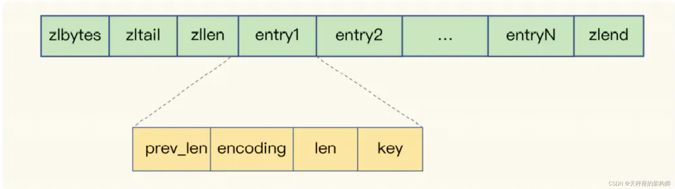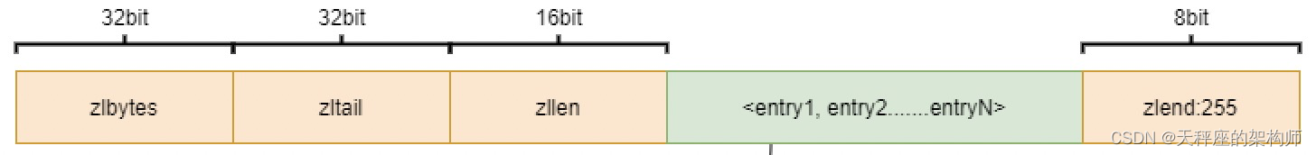 <zlbytes>: 32bit,表示ziplist占用内存的字节总数(也包括<zlbytes>本身占用的4个字节),在对压缩列表进行重新内存分配,或者计算zllen的位置时使用;<zltail>: 32bit,表示ziplist表中最后一项(entry)的起始偏移量在ziplist中的起始地址有多少字节。<zltail>的存在,使得我们可以很方便地找到最后一项(不用遍历整个ziplist),从而可以在ziplist尾端快速地执行push或pop操作。<zllen>: 16bit, 表示ziplist中数据项(entry)的个数。zllen字段因为只有16bit,所以可以表达的最大值为2^16-1。这里需要特别注意的是,如果ziplist中数据项个数超过了16bit能表达的最大值,ziplist仍然可以来表示。那怎么表示呢?这里做了这样的规定:如果<zllen>小于等于2^16-2(也就是不等于2^16-1),那么<zllen>就表示ziplist中数据项的个数;否则,也就是<zllen>等于16bit全为1的情况,那么<zllen>就不表示数据项个数了,这时候要想知道ziplist中数据项总数,那么必须对ziplist从头到尾遍历各个数据项,才能计数出来。<entry>: 表示真正存放数据的数据项,长度不定。一个数据项(entry)也有它自己的内部结构,这个稍后再解释。<zlend>: ziplist最后1个字节,是一个结束标记,值固定等于255。