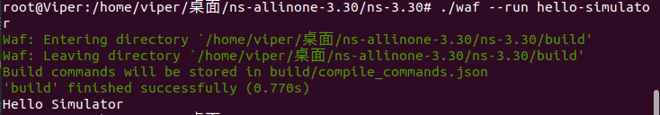 我们通常使用waf运行脚本程序。在正确编译了NS3软件包之后,如果要运行一个程序,只需在waf后加入–run选项即可。让我们在ns-3环境下运行常见的HelloSimulator程序,该程序就相当于学习一门语言时的Hello World程序: