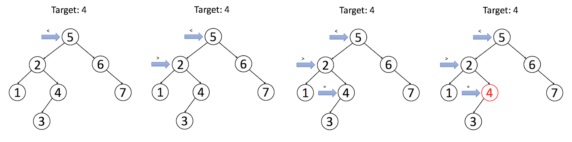 - 根据节点值与目标节点值的关系,搜索左子树或右子树;