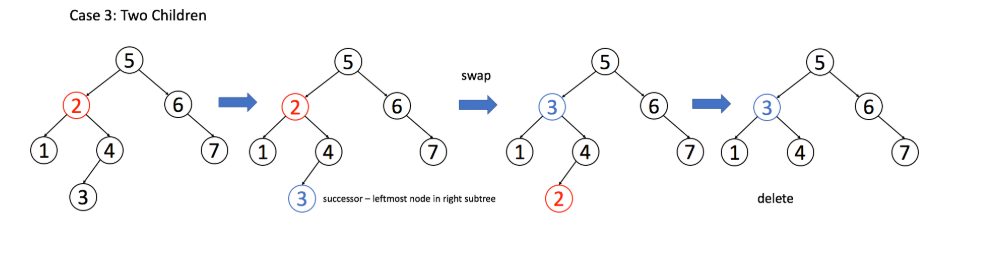 3. 如果目标节点***有两个子节点***,我们需要用其中序后继节点或者前驱节点来替换,再删除该目标节点。