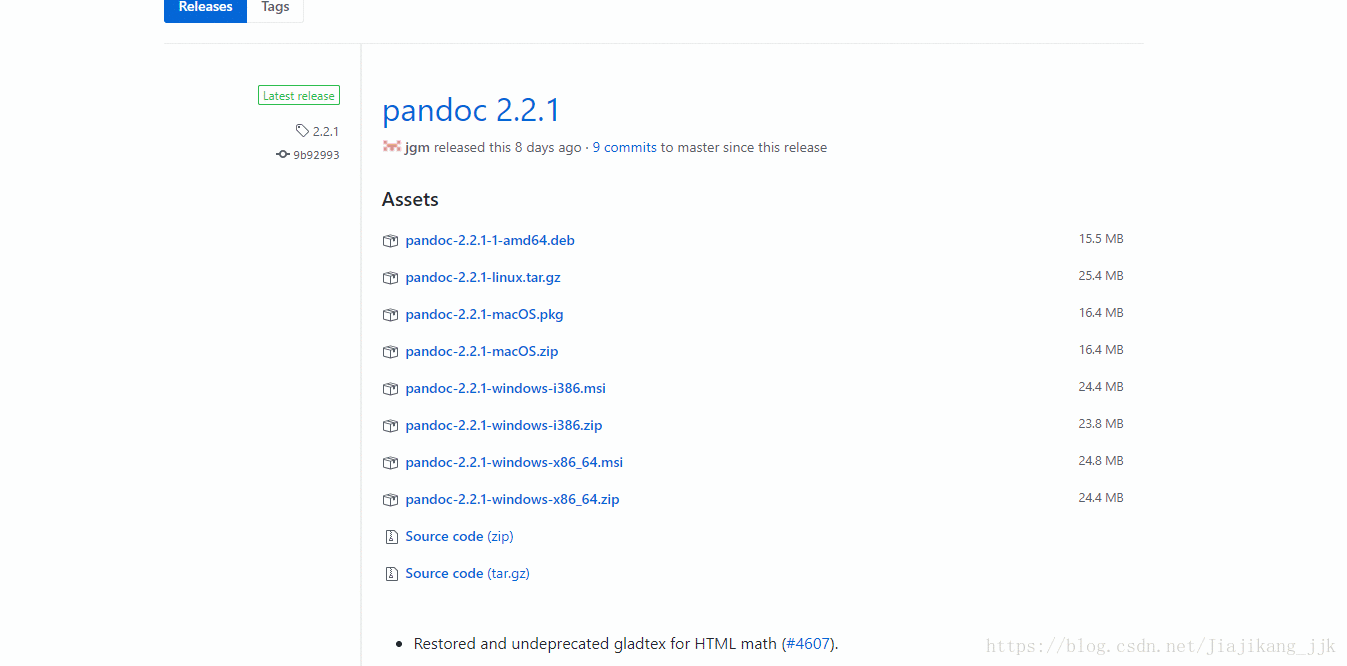 1.pandoc官网获取安装包:https://github.com/jgm/pandoc/releases/tag/2.2.1