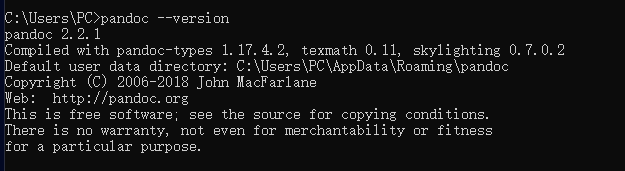 打开cmd控制台,输入pandoc –-version,出现以下结果则说明安装成功。