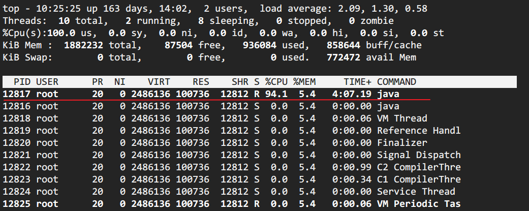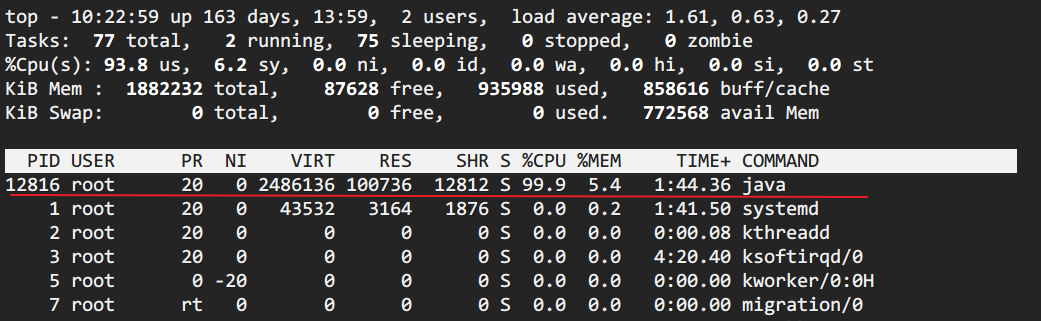 top命令,查看所有进程占系统CPU的排序,定位是哪个进程搞的鬼。在本例中就是咱们的java进程。PID那一列就是进程号。(对指示符含义不清楚的见【附录】) -