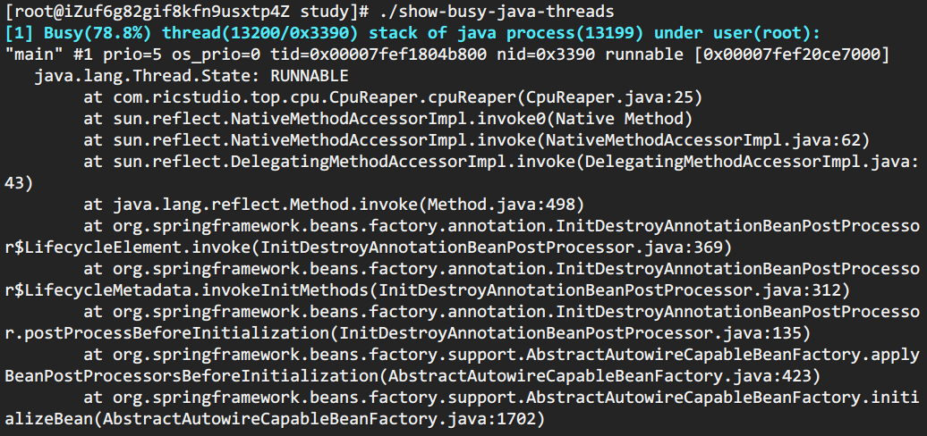 show-busy-java-threads# 从所有运行的Java进程中找出最消耗CPU的线程(缺省5个),打印出其线程栈# 缺省会自动从所有的Java进程中找出最消耗CPU的线程,这样用更方便# 当然你可以手动指定要分析的Java进程Id,以保证只会显示你关心的那个Java进程的信息show-busy-java-threads -p <指定的Java进程Id>