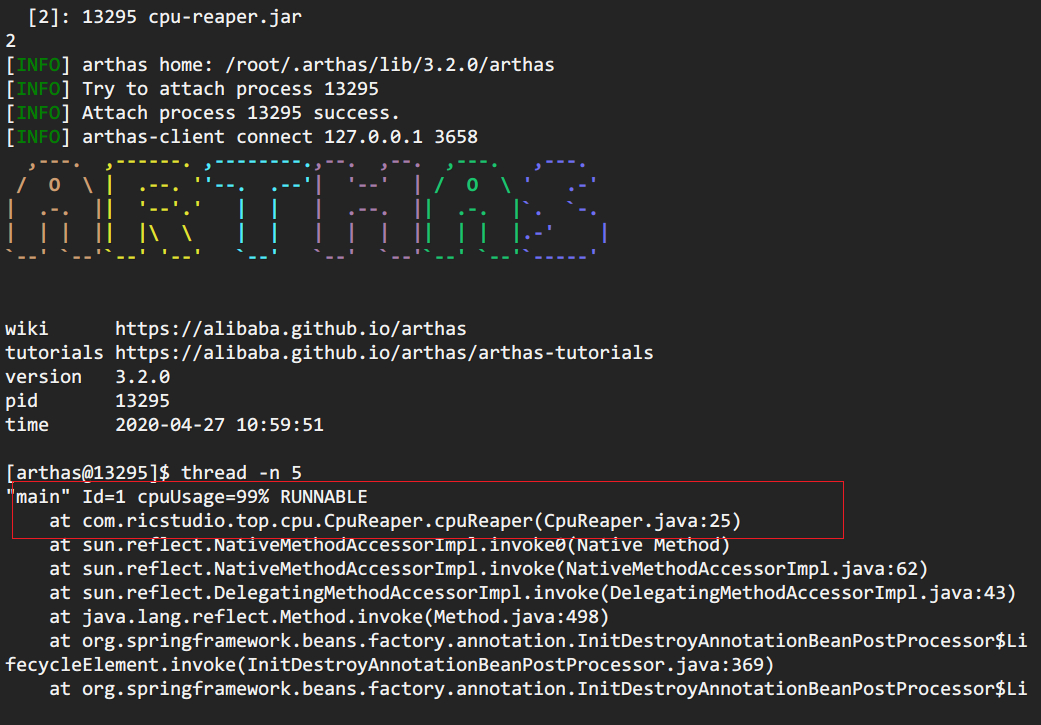 阿里开源的arthas现在已经几乎包揽了我们线上排查问题的工作,提供了一个很完整的工具集。在这个场景中,也只需要一个thread -n命令即可。