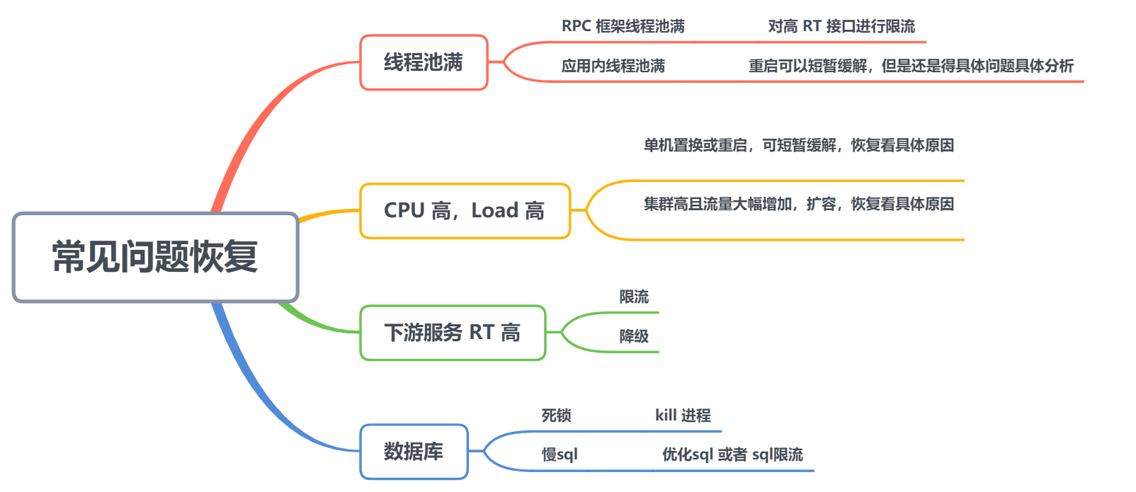 只不过这里先提示一下。在线上应急过程中要记住,只有一个总体目标:尽快恢复服务,消除影响。 不管处于应急的哪个阶段,我们首先必须想到的是恢复问题,恢复问题不一定能够定位问题,也不一定有完美的解决方案,也许是通过经验判断,也许是预设开关等,但都可能让我们达到快速恢复的目的,然后保留部分现场,再去定位问题、解决问题和复盘。