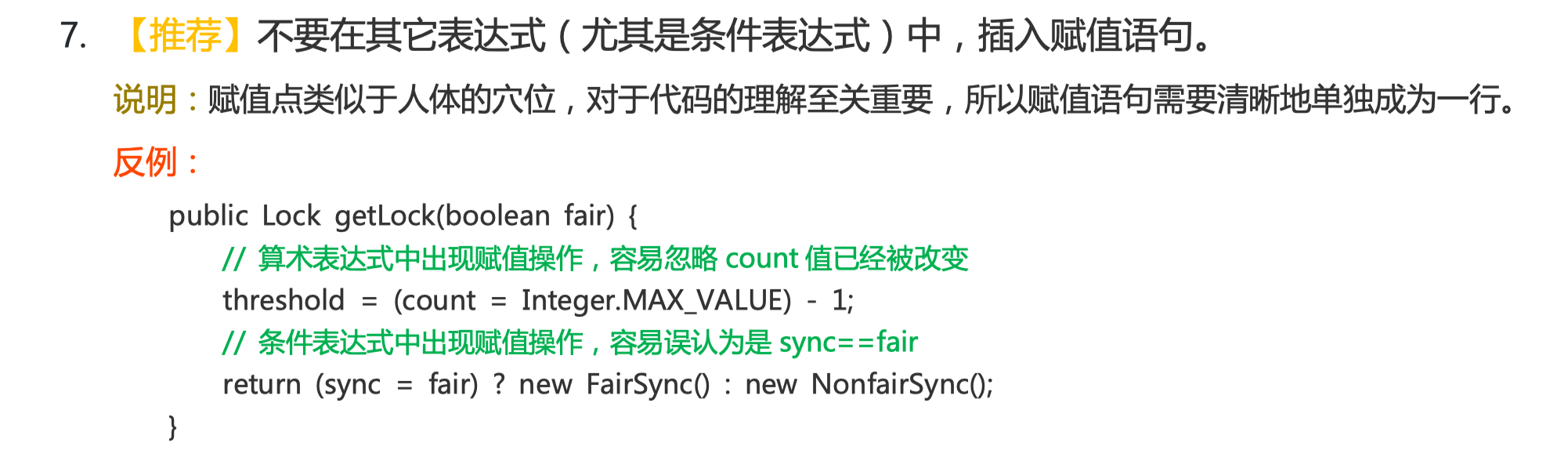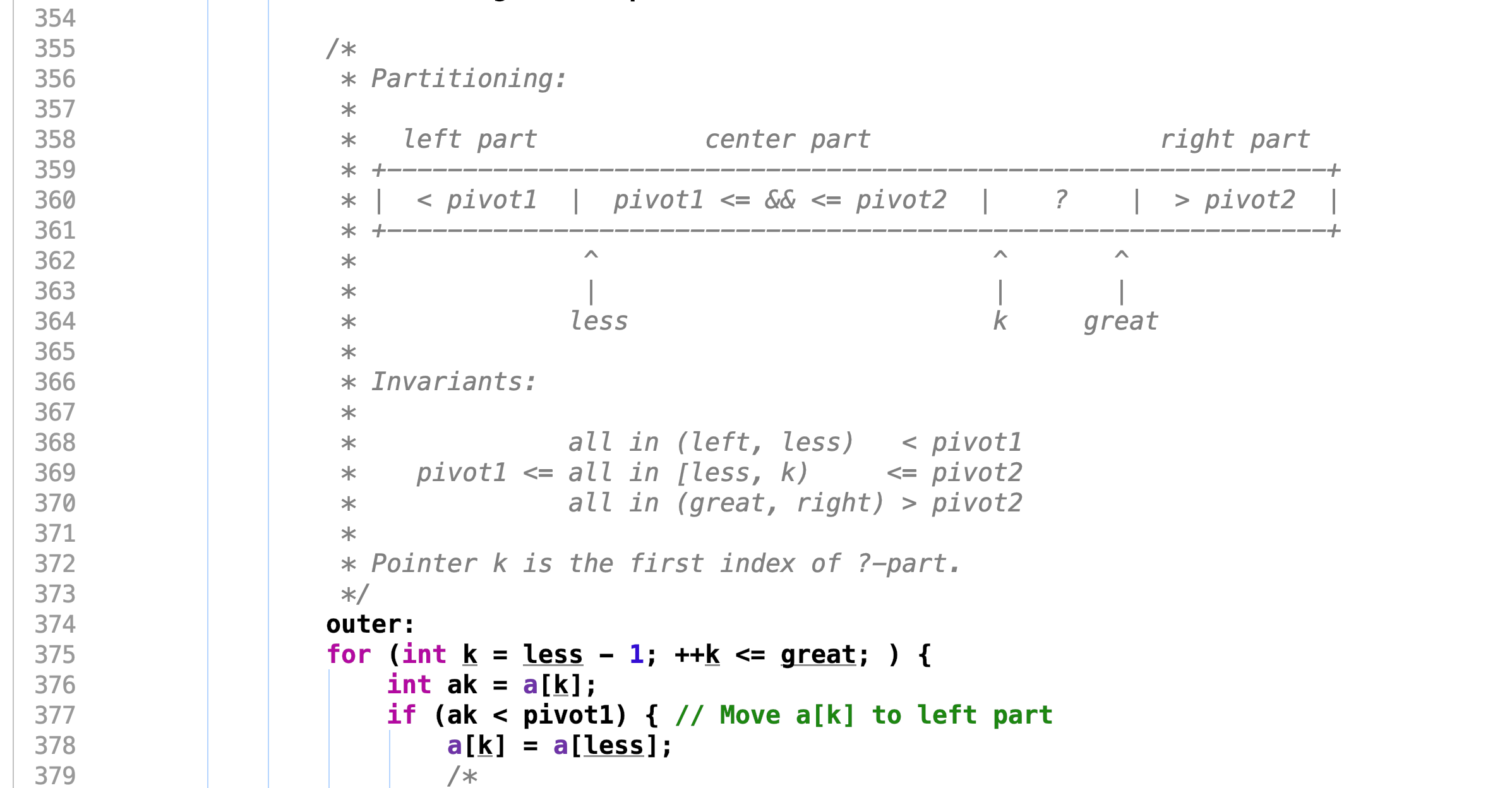 ++k <= great和a[++left] >= a[left - 1]这样的代码建议不要写,会给阅读者带来理解上的障碍,这种做法也是《阿里巴巴 Java 开发手册》中不推荐的,理由是:变量的值发生变化是一个很重要的逻辑,应该单独成为一行,否则不利于调试和以后定位问题,这种语法糖我个人认为应该禁止使用。
