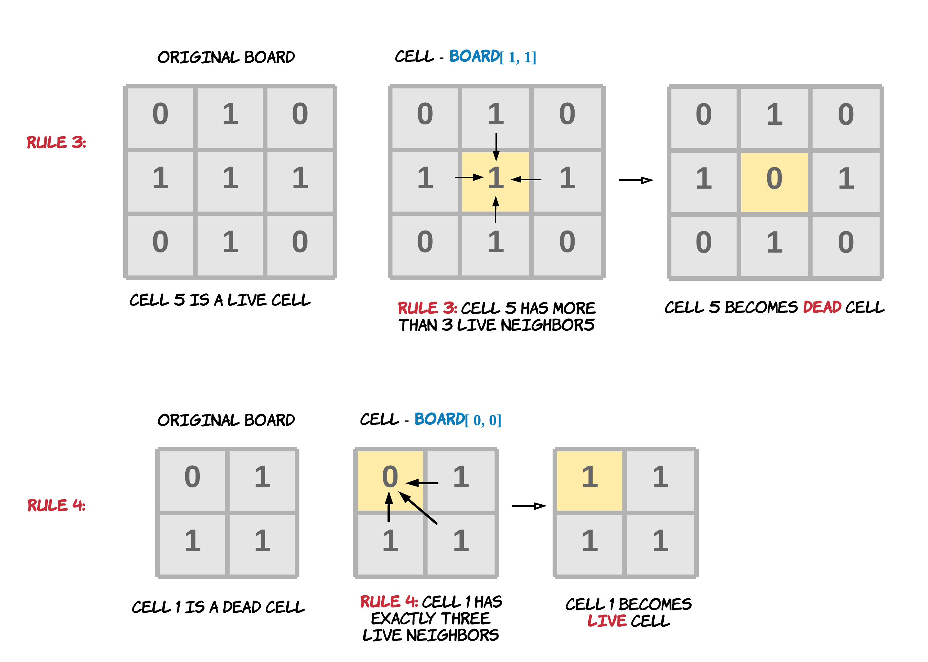 - 如果死细胞周围正好有三个活细胞,则该位置死细胞复活;