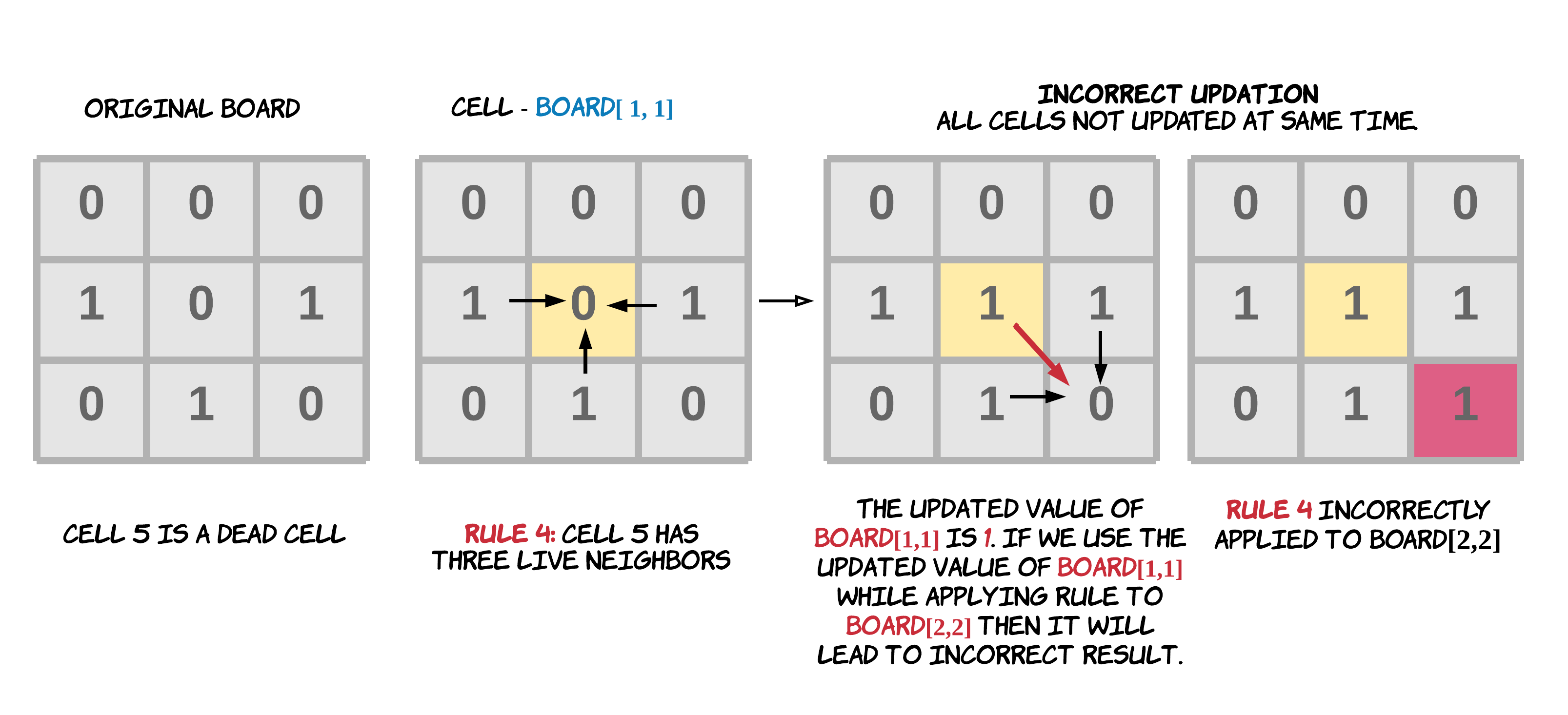 - 你可以使用原地算法解决本题吗?请注意,面板上所有格子需要同时被更新:你不能先更新某些格子,然后使用它们的更新后的值再更新其他格子。