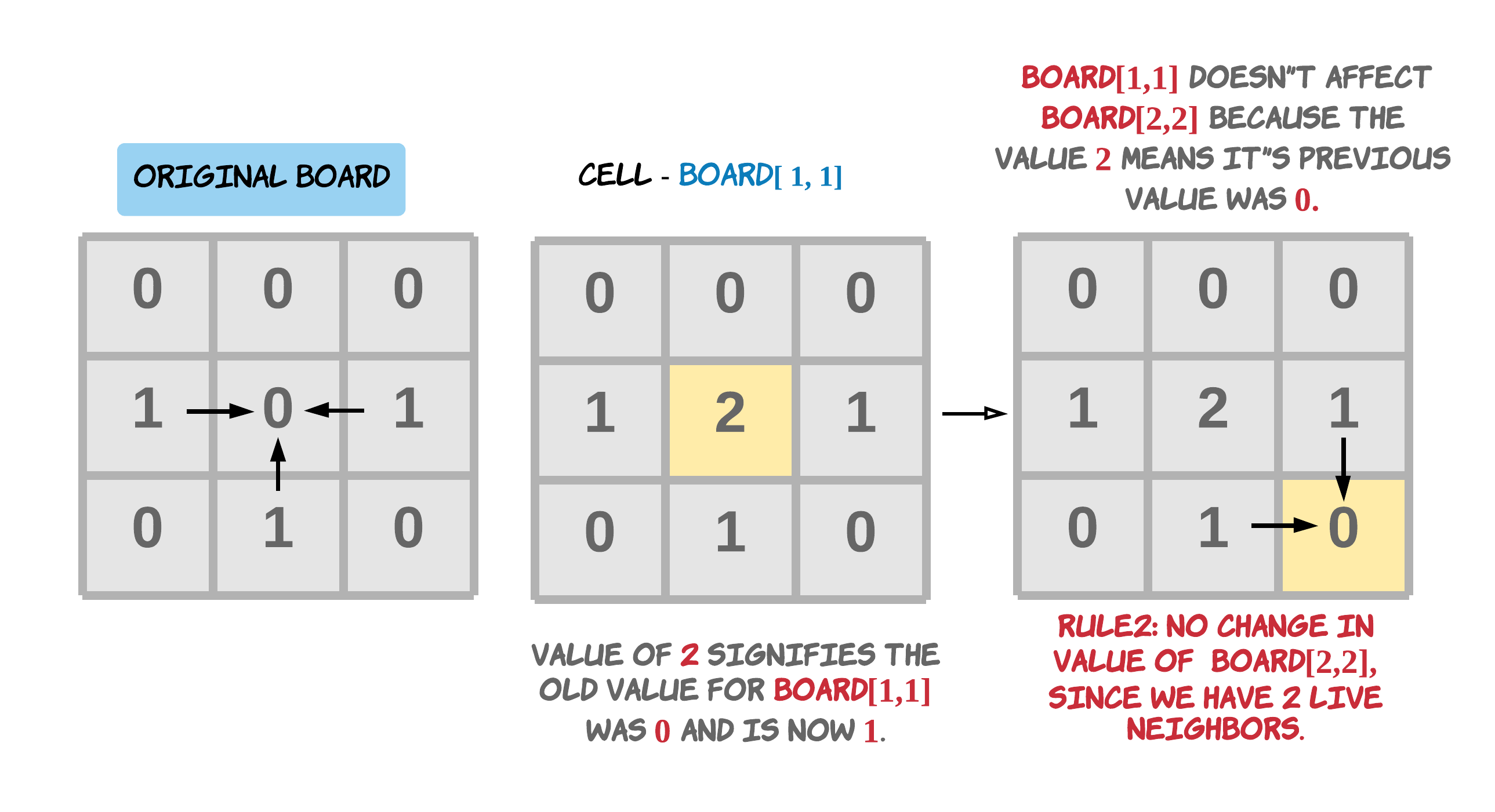 方法一中 O(mn) 的空间复杂度在数组很大的时候内存消耗是非常昂贵的。题目中每个细胞只有两种状态 live(1) 或 dead(0),但我们可以拓展一些复合状态使其包含之前的状态。举个例子,如果细胞之前的状态是 0,但是在更新之后变成了 1,我们就可以给它定义一个复合状态 2。这样我们看到 2,既能知道目前这个细胞是活的,还能知道它之前是死的。