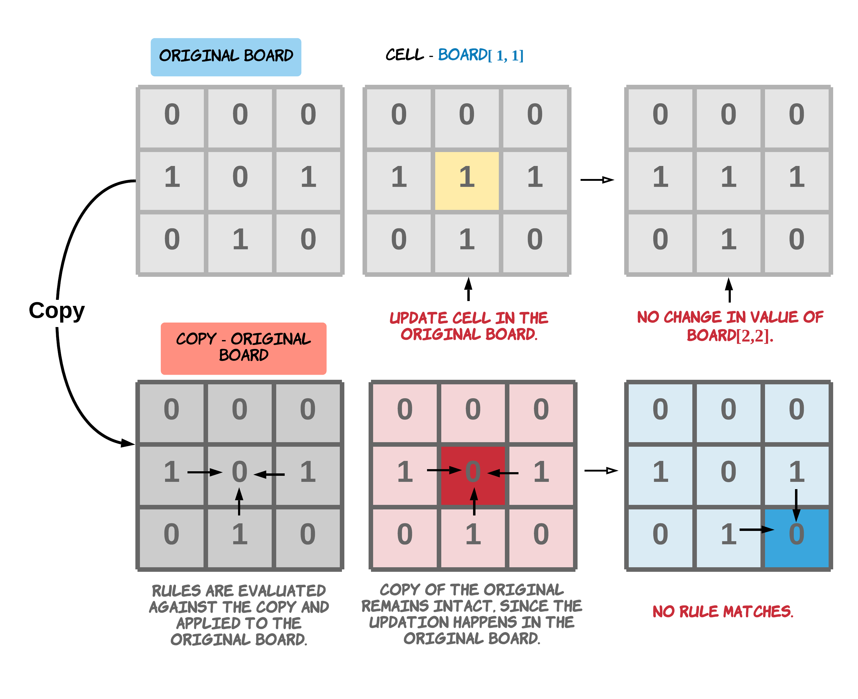 这个问题看起来很简单,但有一个陷阱,如果你直接根据规则更新原始数组,那么就做不到题目中说的 同步 更新。假设你直接将更新后的细胞状态填入原始数组,那么当前轮次其他细胞状态的更新就会引用到当前轮已更新细胞的状态,但实际上每一轮更新需要依赖上一轮细胞的状态,是不能用这一轮的细胞状态来更新的。