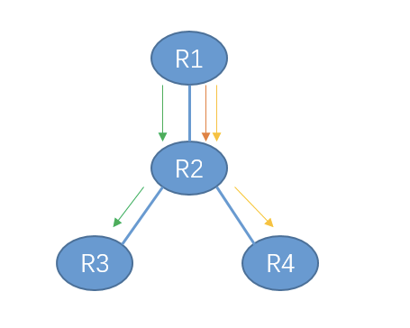 假如节点 R1 要做一个广播给 R2, R3, R4发广播分组,显然,一种很简单的方法就是R1给 R2, R3, R4三个节点分别发一次广播分组,这意味着R1一共要发送三次同样的广播分组。