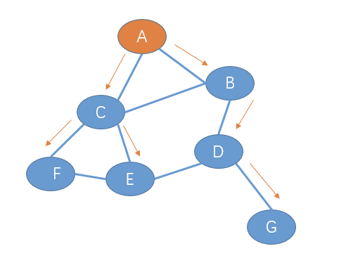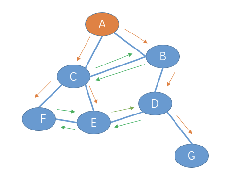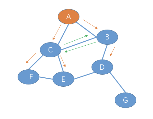 如果 节点 A 要做一个广播,那么 A就会给他的邻居节点B,C发一份广播分组,B,C也会给他的邻居节点发送一个广播分组。意味着B会给 C,D发送广播分组,而 C也会给 B,E,F发送一份广播分组: