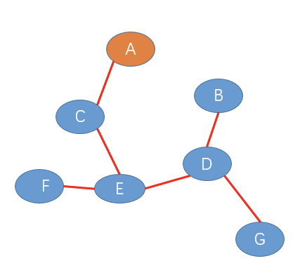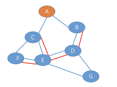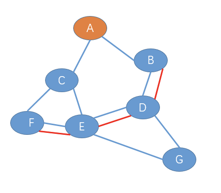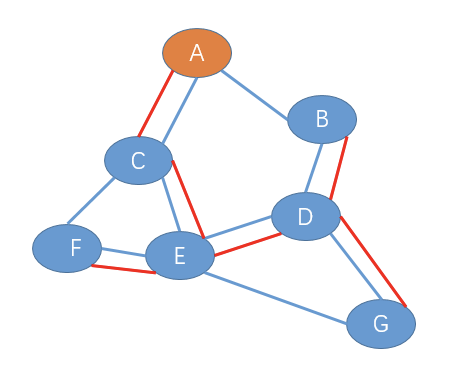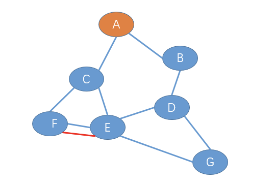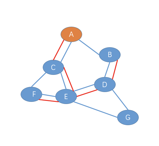 1、F节点给E发送加入树报文,此时E-F链路成为初始的生成树,如下图(红色路径表示生成树)