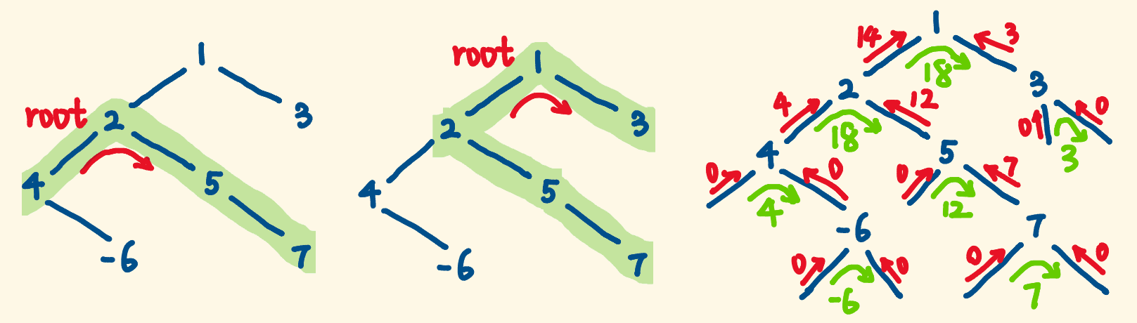 - 每次递归求当前子树能向父节点提供多大的「最大路径和」时,都求一下「当前子树的最大路径和」,与全局的最大比较,试图刷新纪录。