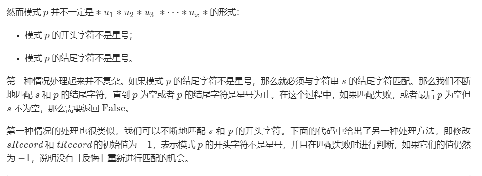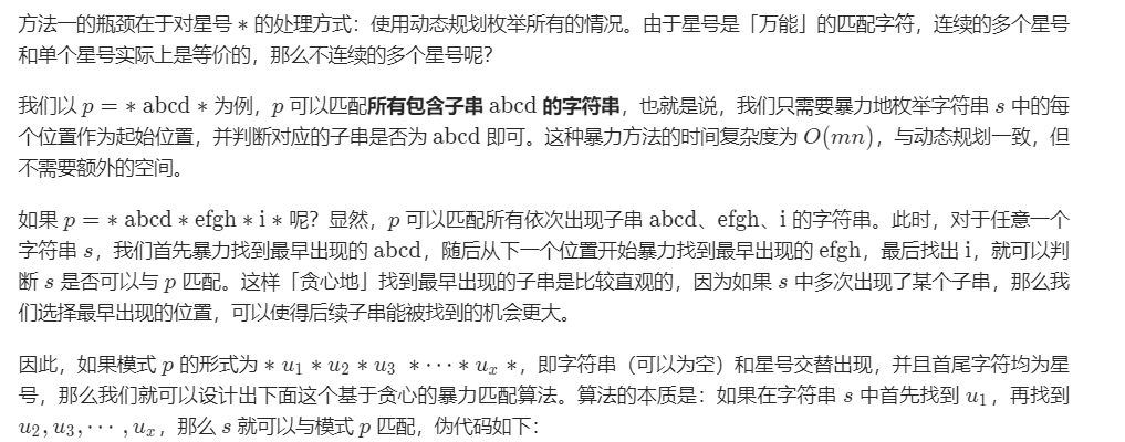 在方法二中,对于每一个被星号分隔的、只包含小写字符和问号的子模式 uiu_iui,我们在原串中使用的是暴力匹配的方法。然而这里是可以继续进行优化的,即使用 AC 自动机 代替暴力方法进行匹配。由于 AC 自动机本身已经是竞赛难度的知识点,而本题还需要在 AC 自动机中额外存储一些内容才能完成匹配,因此这种做法远远超过了面试难度。这里只给出参考讲义 [Set Matching and Aho-Corasick Algorithm](http://www.cs.cmu.edu/~ab/CMU/Week 10- Strings Search/print04.pdf):
