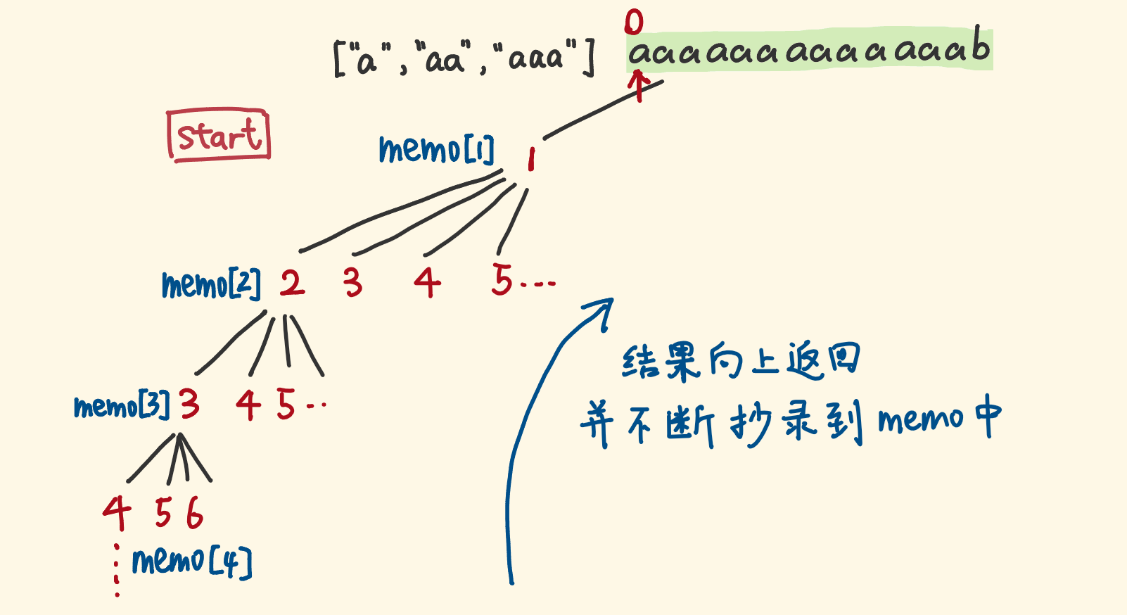 - 用一个数组,去存之前计算的结果,数组索引对应指针位置,值对应子调用的结果。下次遇到相同的子问题,直接返回数组中的缓存值