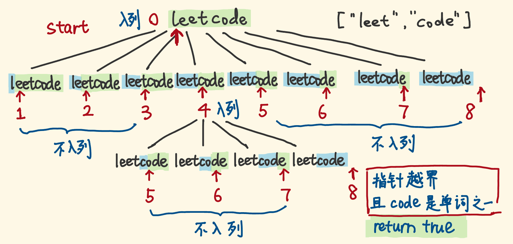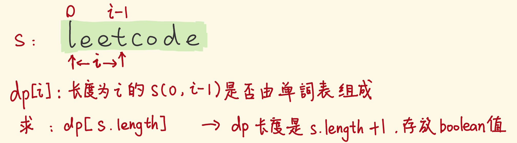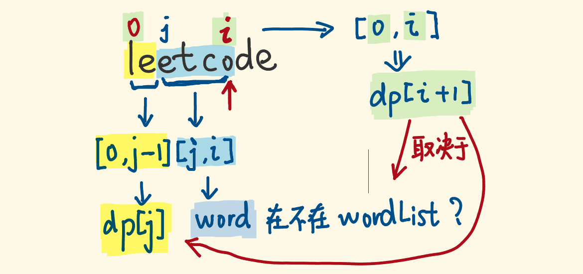 - "leetcode"能否break,可以拆分为:"l"是否是单词表的单词、剩余子串能否break,"le"是否是单词表的单词、剩余子串能否break……