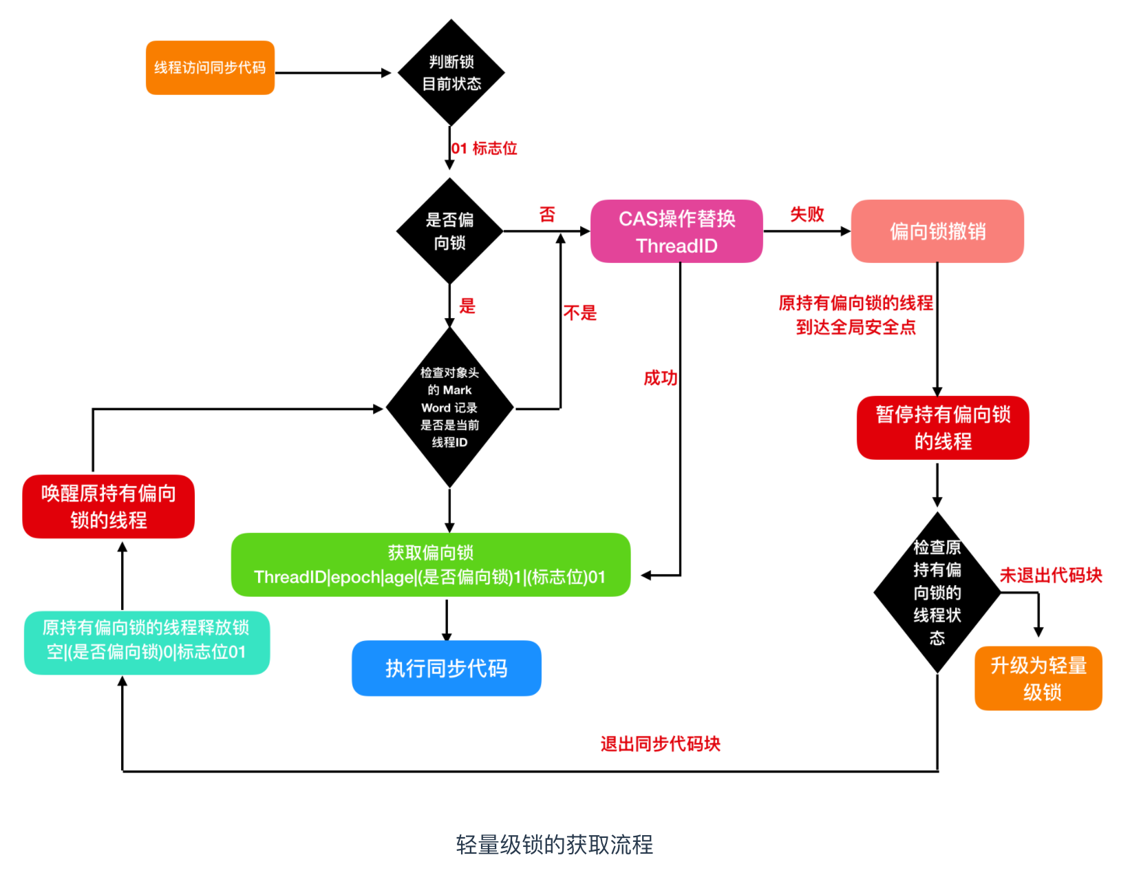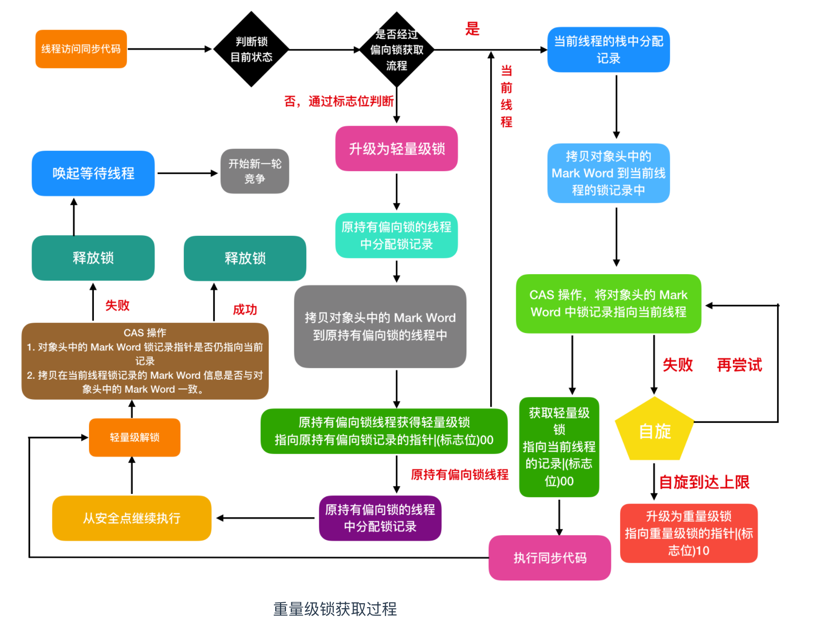 当前线程没有使用 CAS 成功获取锁,就会自旋一会儿,再次尝试获取,如果在多次自旋到达上限后还没有获取到锁,那么轻量级锁就会升级为