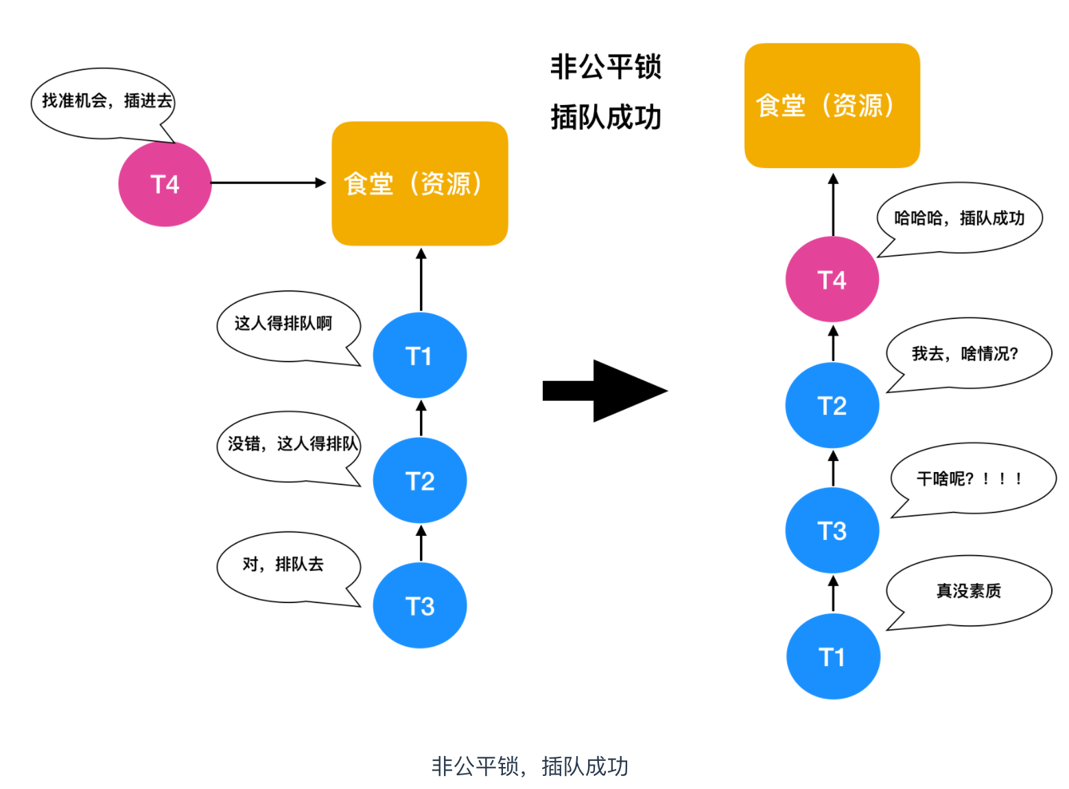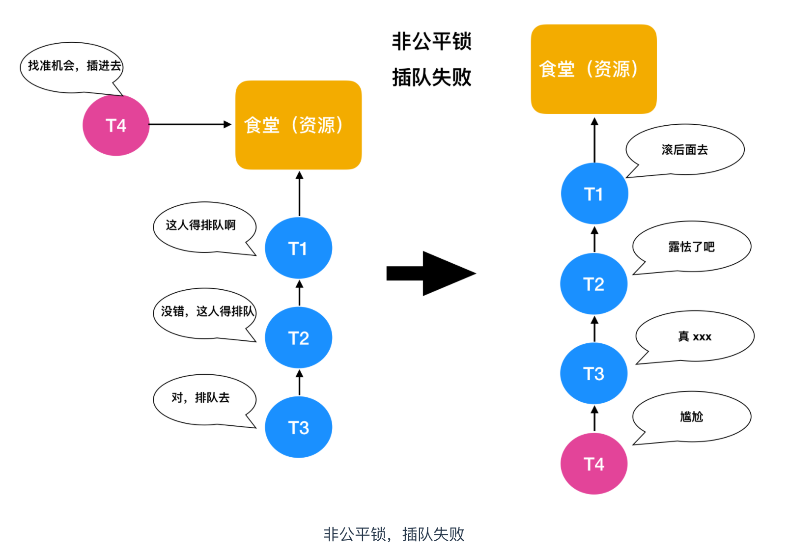 我们知道,在并发环境中,多个线程需要对同一资源进行访问,同一时刻只能有一个线程能够获取到锁并进行资源访问,那么剩下的这些线程怎么办呢?这就好比食堂排队打饭的模型,最先到达食堂的人拥有最先买饭的权利,那么剩下的人就需要在第一个人后面排队,这是理想的情况,即每个人都能够买上饭。那么现实情况是,在你排队的过程中,就有个别不老实的人想走捷径,插队打饭,如果插队的这个人后面没有人制止他这种行为,他就能够顺利买上饭,如果有人制止,他就也得去队伍后面排队。