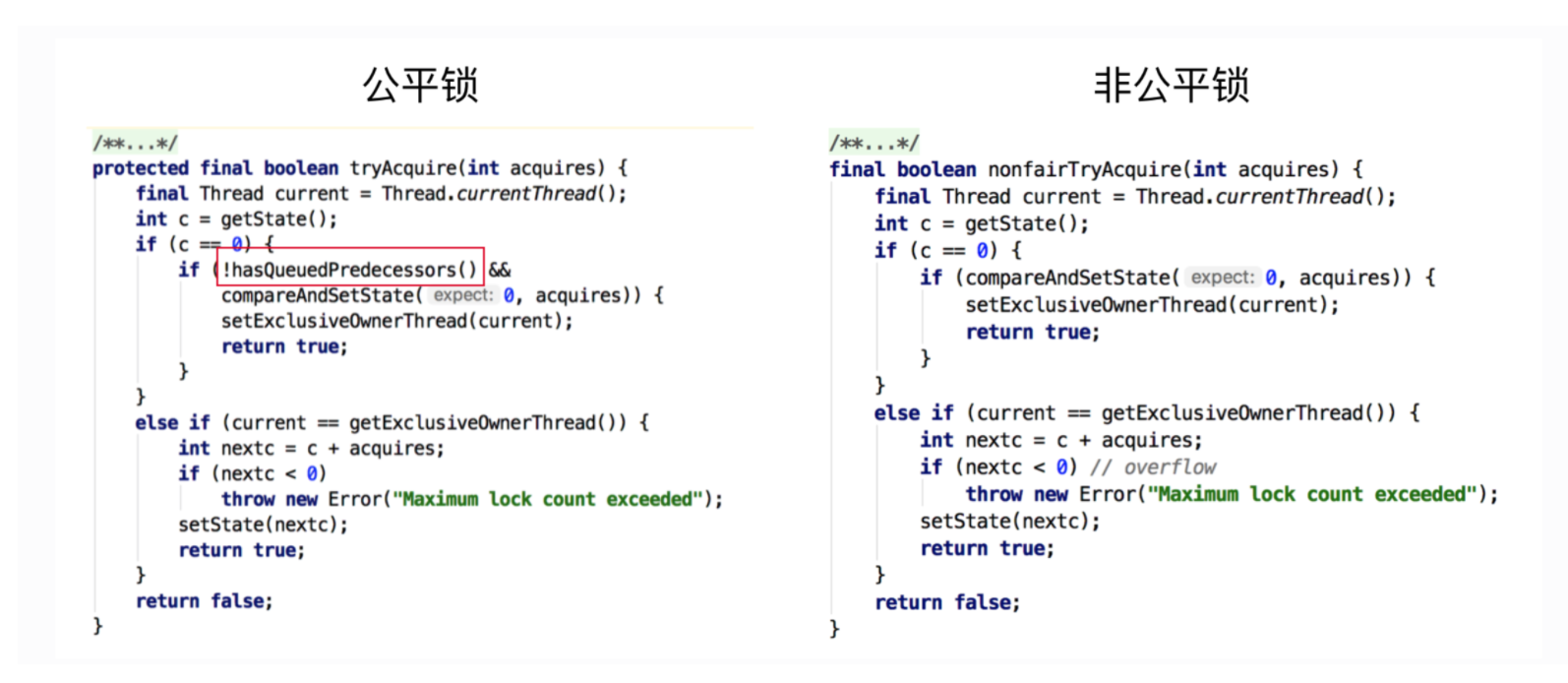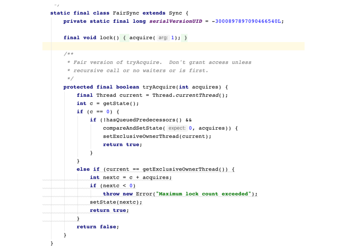 由继承图可以看到,两个类的继承关系都是相同的,我们从源码发现,公平锁和非公平锁的实现就是下面这段代码的区别(下一篇文章我们会从原理角度分析一下公平锁和非公平锁的实现)