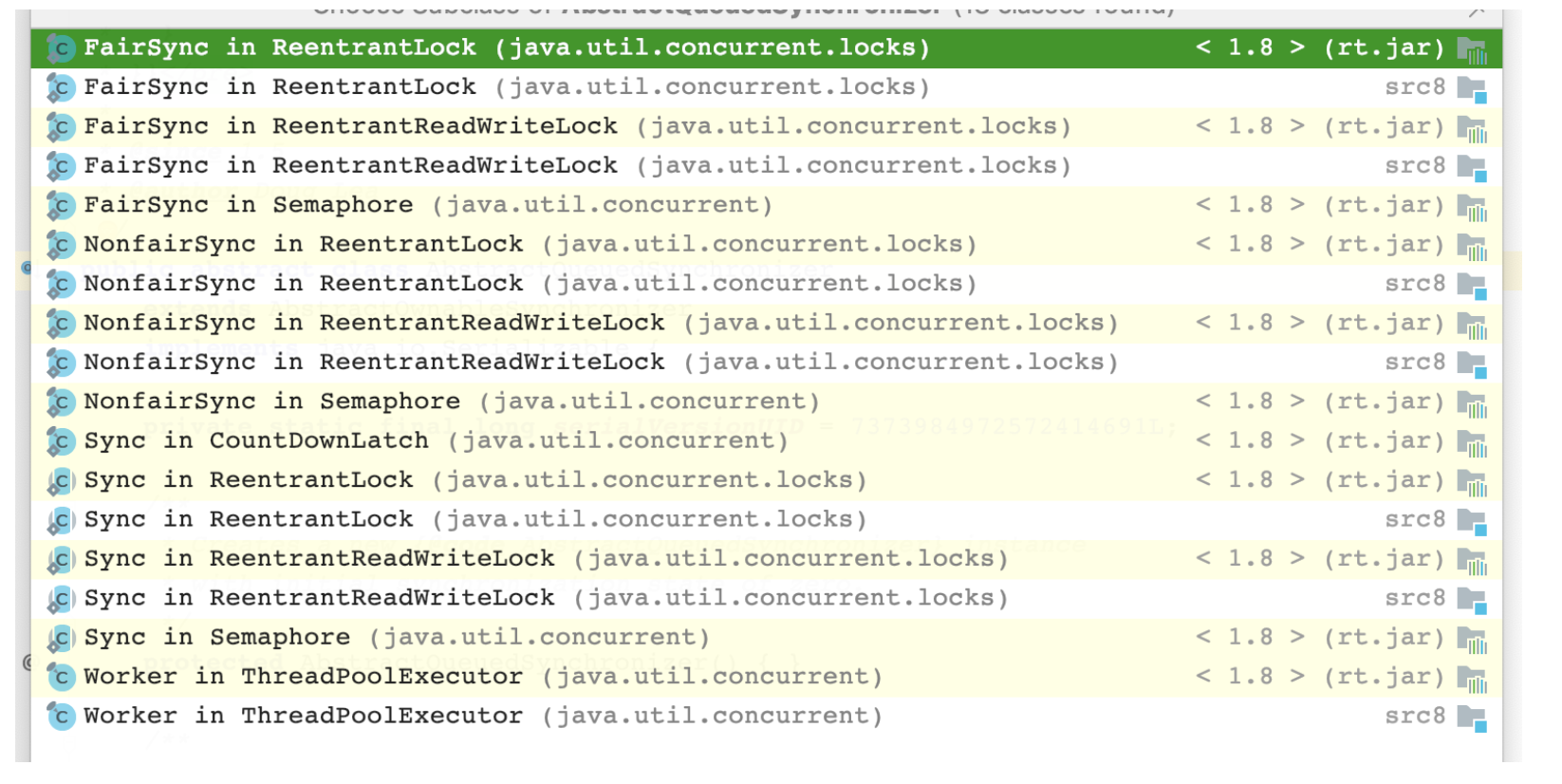 我们可以看到,所有实现了 AQS 的类都位于 JUC 包下,主要有五类:ReentrantLock、ReentrantReadWriteLock、Semaphore、CountDownLatch 和 ThreadPoolExecutor,其中 ReentrantLock、ReentrantReadWriteLock、Semaphore 都可以实现公平锁和非公平锁。