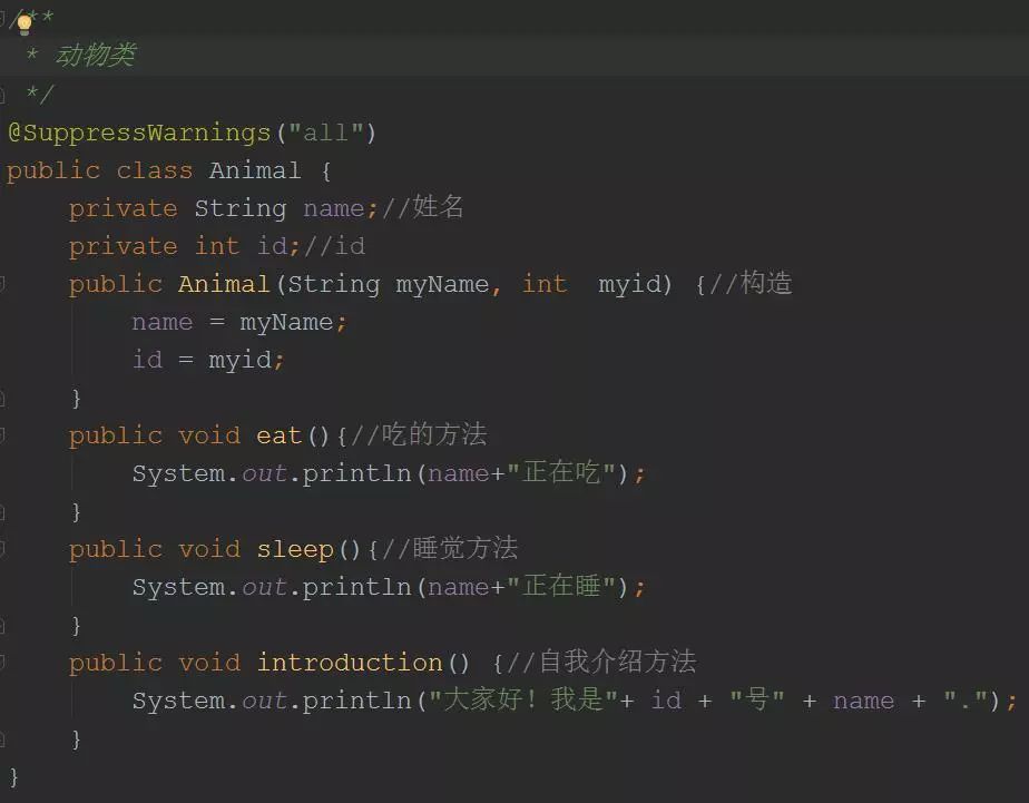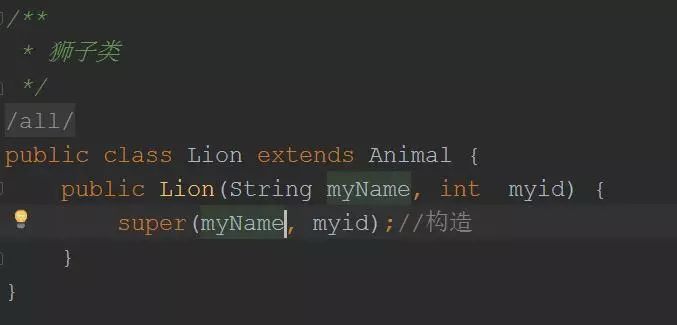 继承是java面向对象编程技术的一块基石,因为它允许创建分等级层次的类。 继承就是子类继承父类的特征和行为,使得子类对象(实例)具有父类的实例域和方法,或子类从父类继承方法,使得子类具有父类相同的行为。 如图 动物类下有一个食肉类和一个食草类 食肉类下有一个狮子类和一个老虎类 食草类下有一个绵羊和山羊类 接下来我们通过实例来说明这个需求。 开发动物类,其中动物分别为老虎以及狮子,要求如下: 老虎:属性(姓名,id),方法(吃,睡,自我介绍) 狮子:属性(姓名,id),方法(吃,睡,自我介绍) 从这两段代码可以看出来,代码存在重复了,导致后果就是代码大量重复,而且维护性不高(维护性主要是后期需要修改的时候,就需要修改很多的代码,容易出错),所以要从根本上解决这两段代码的问题,就需要继承,将两段代码中相同的部分提取出来组成一个父类。 在 Java 中通过 extends 关键字可以申明一个类是从另外一个类继承而来的,一般形式如下: class 父类 { } class 子类 extends 父类 { } 现在提取动物类: 用老虎类和狮子类继承动物类即可。 老虎类代码: 狮子类代码: 这样就完成继承了。 PS 子类拥有父类非private的属性,方法。子类可以拥有自己的属性和方法,即子类可以对父类进行扩展。子类可以用自己的方式实现父类的方法。 Java的继承是单继承,但是可以多重继承,单继承就是一个子类只能继承一个父类,多重继承就是,例如A类继承B类,B类继承C类,所以按照关系就是C类是B类的父类,B类是A类的父类,这是java继承区别于C++继承的一个特性。提高了类之间的耦合性(继承的缺点,耦合度高就会造成代码之间的联系)。
