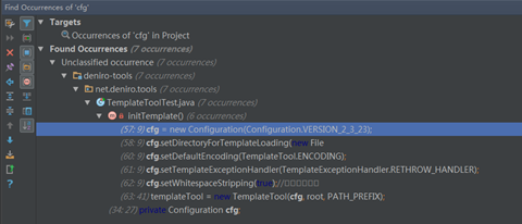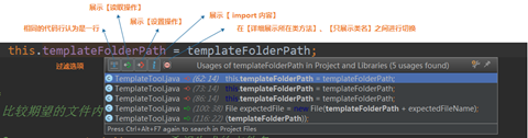 | Ctrl + F7 | Find usages in file | 在当前文件中的使用情况,找的内容会低亮显示。 |