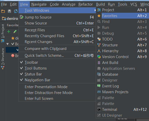 书签不是默认视图,所以我们要把它添加到当前视图中:View -> Tool Windows -> Favorites,打开 Favorites 面板:
