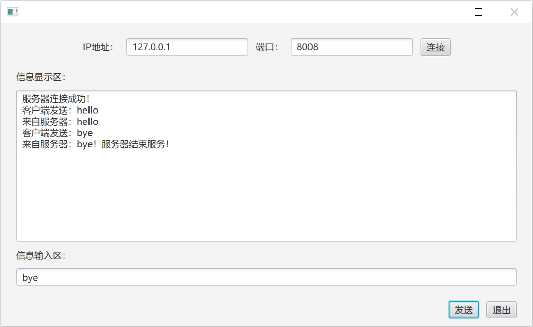该窗体界面可参考第一讲SimpleFX的界面设计方法,在其基础上略作修改。例如可以添加一个HBox面板,用于容纳最上一行ip地址、端口输入框及连接按钮等控件,然后把这个HBox添加到主界面中央的VBox中,就可以达到类似图示效果。