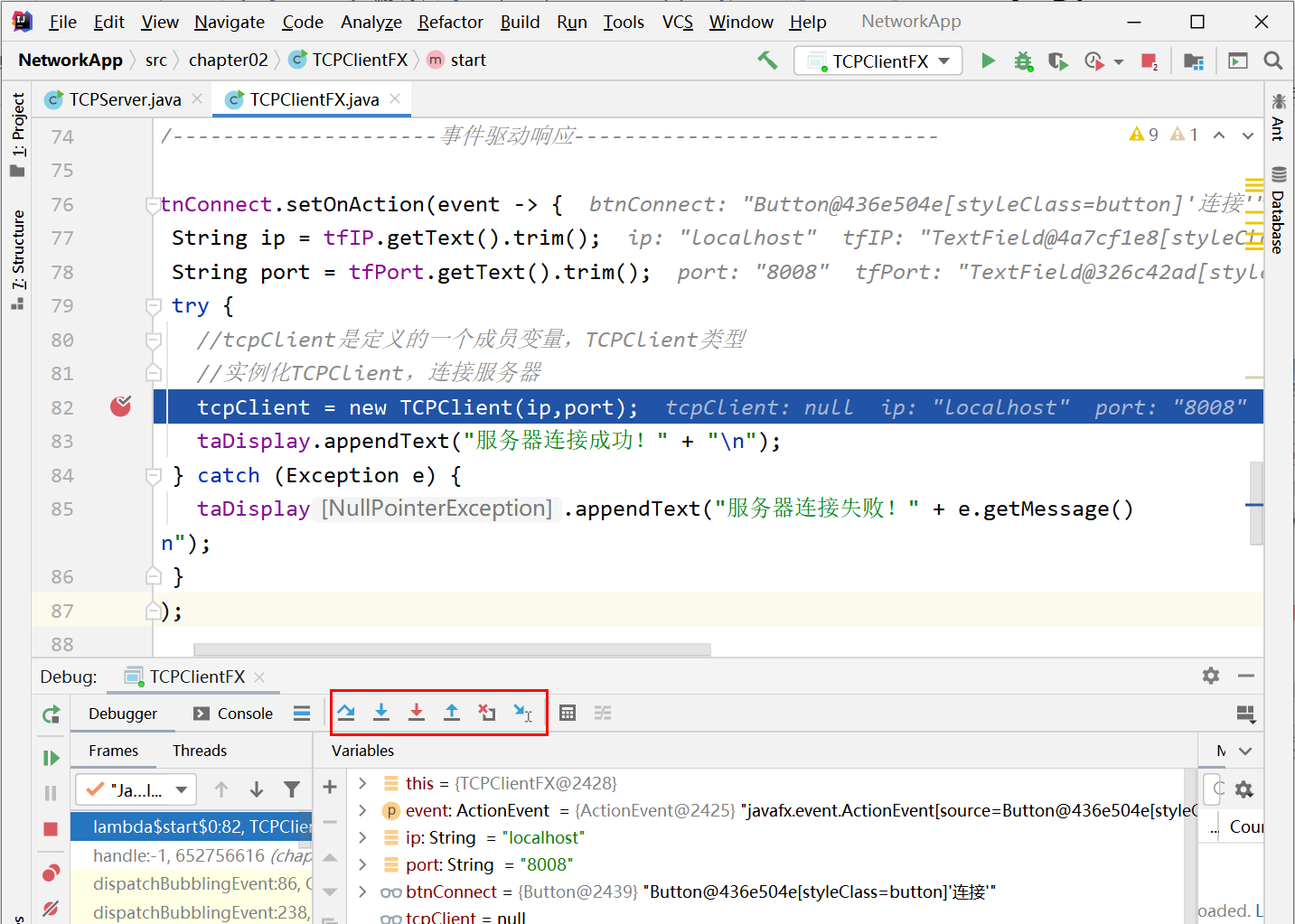 右上角下拉框选中“TCPClientFX”,再点击“调试”图标,窗口程序运行到红色断点行时会停留,便于观察此时IP、port等变量的状态值,如图3.2所示。通过图3-2所示红色框区域,可以让程序单步执行,一步一步地观察程序执行的情况,如果当前行代码中有方法的调用,step