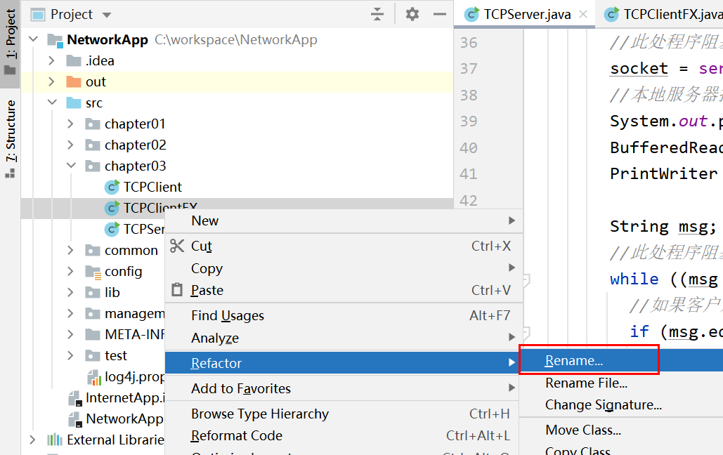 现在右键选择TCPClientFX.java重构,重命名为TCPClientThreadFX.java(采用如图3.5所示的方式),