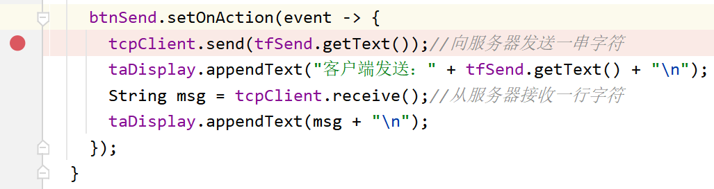然后,在客户端窗口程序TCPClientFX中选择一行有变量的代码行(如图3.1,要查看获取的IP地址是否符合预期),鼠标点击行号右侧标注断点;