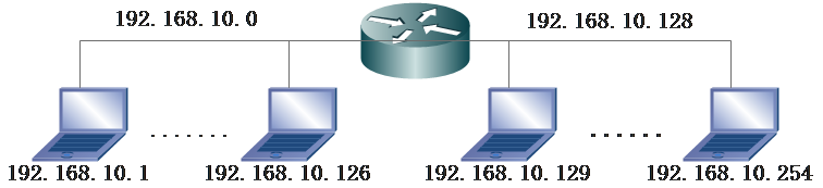 128的二进制表示为10000000,只有1位用于定义子网,余下7位用于定义主机。这里将对C类网络192.168.10.0进行子网划分。