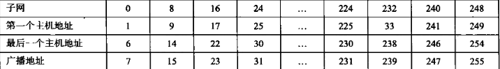 由于子网掩码是224,所以子网步长为256-224=32 - 求有哪些合法子网: