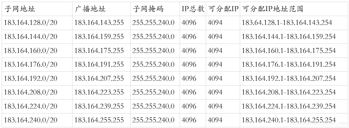 广播地址:就是前20位网络地址不变,主机地址的12位IP地址都是1——183.164.1XXX1111.255