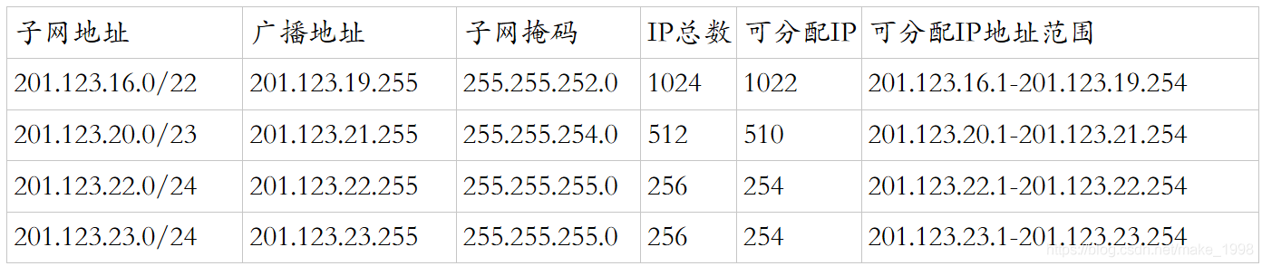 即:201.123.20.0/23和201.123.22.0/23。可以分配29-2=510个IP地址