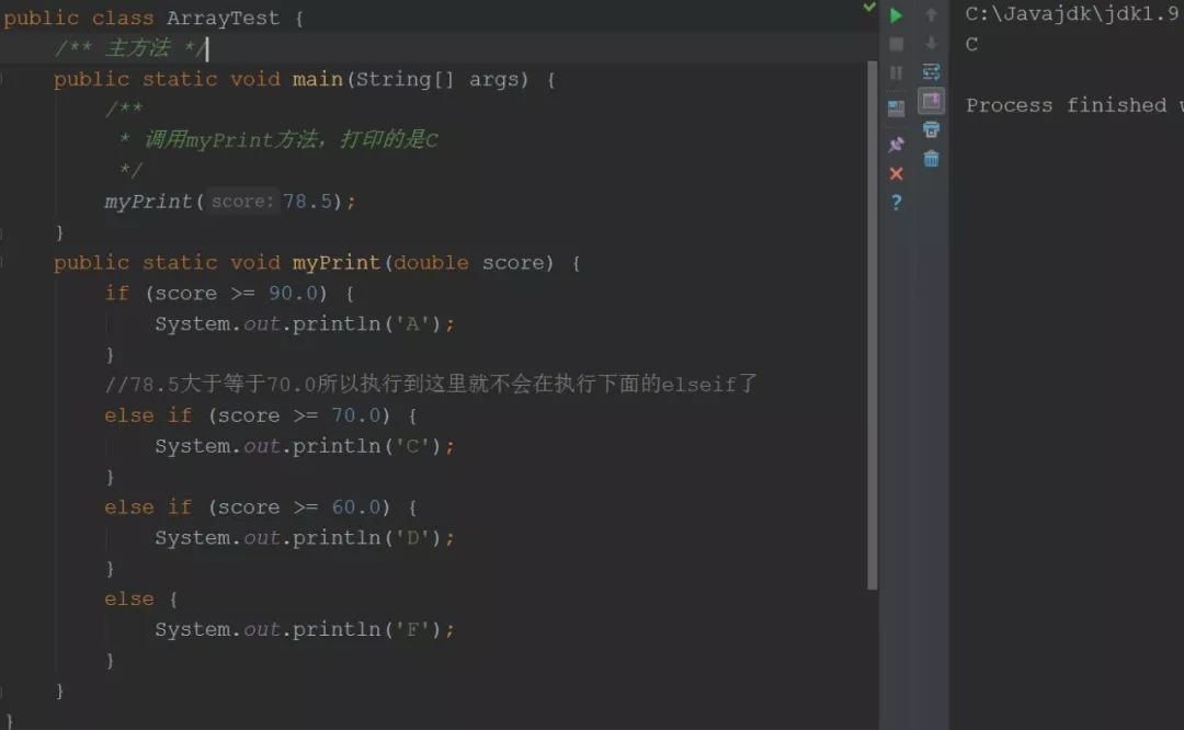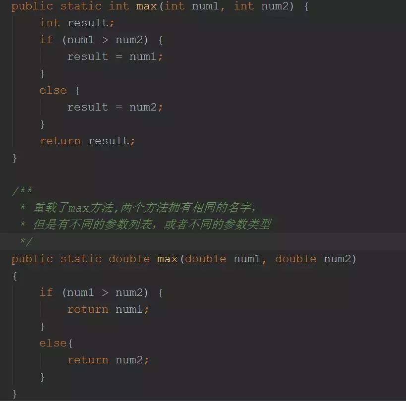 在前面几个章节中我们经常使用到 System.out.println(),那么它是什么呢? println() 是一个方法。 System 是系统类。 out 是标准输出对象。 这句话的用法是调用系统类 System 中的标准输出对象 out 中的方法 println()。 那么什么是方法呢? Java方法是语句的集合,它们在一起执行一个功能。 方法是解决一类问题的步骤的有序组合 方法包含于类或对象中 方法在程序中被创建,在其他地方被引用 1. 使程序变得更简短而清晰。 2. 有利于程序维护。 3. 可以提高程序开发的效率。 4. 提高了代码的重用性。 1.方法的名字的第一个单词应以小写字母作为开头,后面的单词则用大写字母开头写,不使用连接符。例如:addPerson。 2.下划线可能出现在 JUnit 测试方法名称中用以分隔名称的逻辑组件。一个典型的模式是:test<MethodUnderTest>_<state>,例如 testPop_emptyStack。 一般情况下,定义一个方法包含以下语法: 修饰符 返回值类型 方法名(参数类型 参数名){ ... 方法体 ... return 返回值; } 定义方法如图: 方法包含一个方法头和一个方法体。下面是一个方法的所有部分: 修饰符:修饰符,这是可选的,告诉编译器如何调用该方法。定义了该方法的访问类型。 返回值类型 :方法可能会返回值。Return ValueType 是方法返回值的数据类型。有些方法执行所需的操作,但没有返回值。在这种情况下,return ValueType 是关键字void。 方法名:是方法的实际名称。方法名和参数表共同构成方法签名。 参数类型:参数像是一个占位符。当方法被调用时,传递值给参数。这个值被称为实参或变量。参数列表是指方法的参数类型、顺序和参数的个数。参数是可选的,方法可以不包含任何参数。在JAVA中只有值传递! 方法体:方法体包含具体的语句,定义该方法的功能。 如: 参数可以有多个: PS: 在一些其它语言中方法指过程和函数。一个返回非void类型返回值的方法称为函数;一个返回void类型返回值的方法叫做过程。 下面的例子演示了如何定义一个方法,以及如何调用它: 本节说明如何声明和调用一个 void 方法。如果调用一个方法时候需要提供参数,你必须按照参数列表指定的顺序提供。通过值传递参数。 下面的例子声明了一个名为 myPrint 的方法,并且调用它来打印给定的分数。 这里myPrint方法是一个void类型方法,它不返回值。 一个void方法的调用一定是一个语句。 所以,它被在main方法第三行以语句形式调用。就像任何以分号结束的语句一样。 如果你调用max方法时传递的是int型参数,则 int型参数的max方法就会被调用; 如果传递的是double型参数,则double类型的max方法体会被调用,这叫做方法重载; 就是说一个类的两个方法拥有相同的名字,但是有不同的参数列表,或者不同的参数类型 Java编译器根据方法签名判断哪个方法应该被调用。 方法重载可以让程序更清晰易读。执行密切相关任务的方法应该使用相同的名字。 重载的方法必须拥有不同的参数列表。你不能仅仅依据修饰符或者返回类型的不同来重载方法。 如图:方法的优点