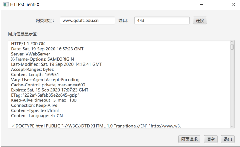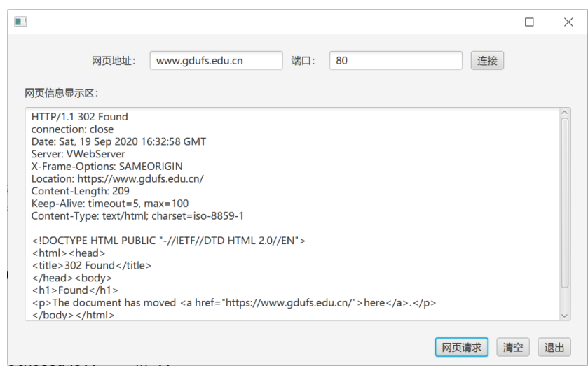 现在将网页地址改为www.gdufs.edu.cn,其它不变,再次连接并点击网页请求,结果如图8.3所示: