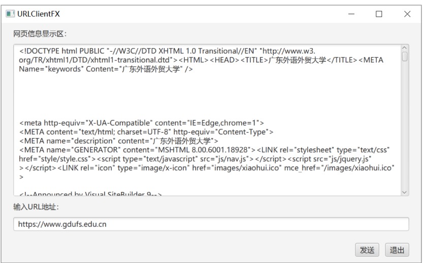 (3)运行该程序,界面如图8.4所示,可以看到已经能够正常获取到广外官网首页的内容。