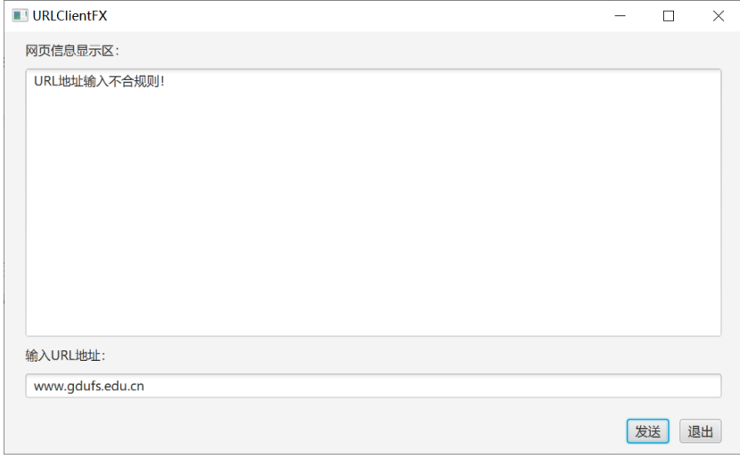 (2)如果用户的输入不符合URL语法,你的程序不是简单地报错,而是在显示区提醒用户输入地址不合规,如图8.6所示。