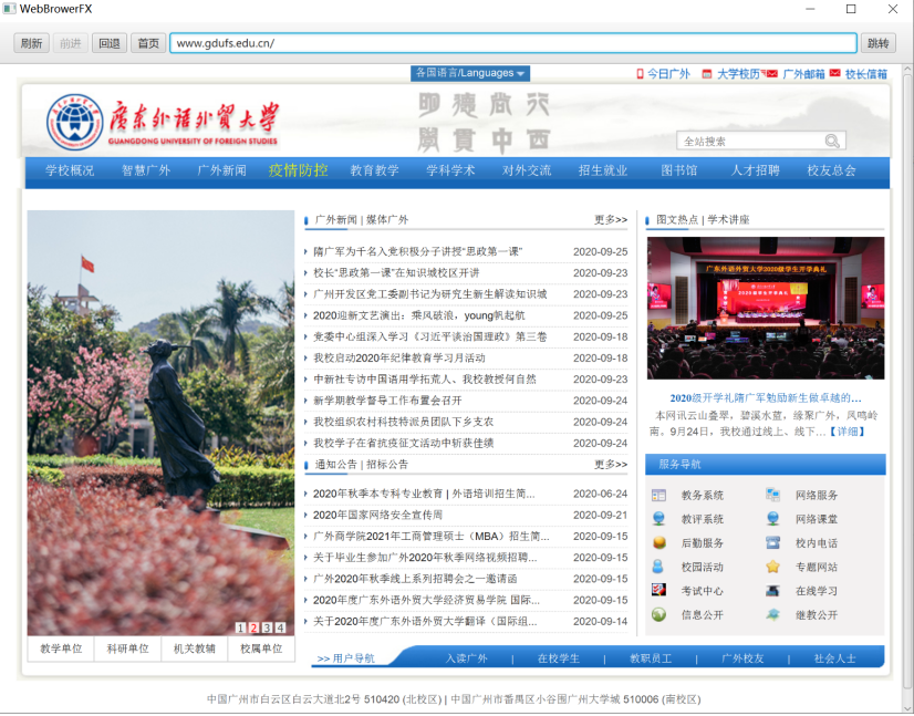 广外首页的内容就会加载显示在webView组件中,webEngine 如果再次 load另外一个URL,则webView就自动加载另外一个页面的内容。