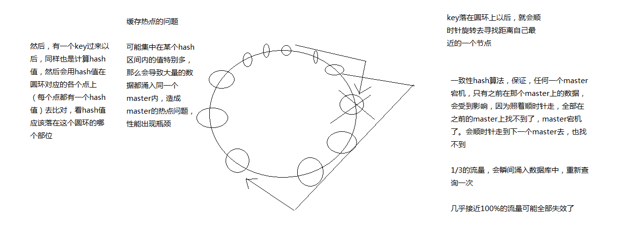 因为上面的一致性Hash环,不能解决缓存热点问题,即集中在某个Hash区间内的值特别多,这样就会导致大量的请求同时涌入一个master节点,而其它的节点处于空闲状态,从而造成master热点问题。