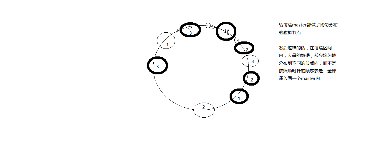 这个时候就引入了虚拟环(虚拟节点)的概念,目的是为了让每个master都做了均匀分布,这样每个区间内的数据都能够 均衡的分布到不同的节点中,而不是按照顺时针去查找,从而造成涌入一个master上的问题。