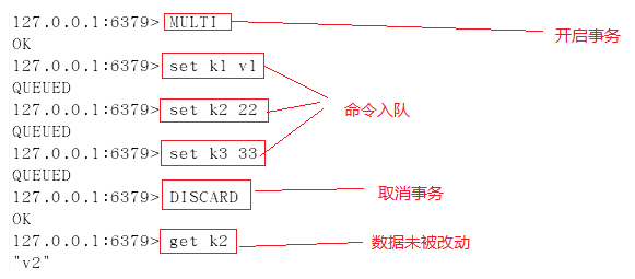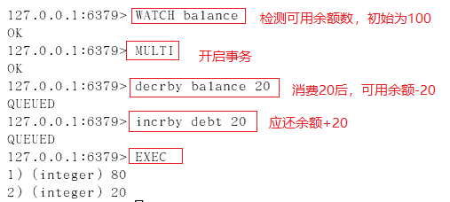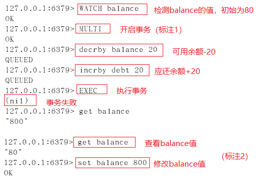 使用watch检测balance,在开启事务后(标注1处),在新窗口执行标注2中的操作,更改balance的值,模拟其他客户端在事务执行期间更改watch监控的数据,然后再执行标注1后命令,执行EXEC后,事务未成功执行。