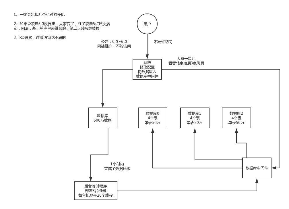 我先给你说一个最low的方案,就是很简单,大家伙儿凌晨12点开始运维,网站或者app挂个公告,说0点到早上6点进行运维,无法访问。。。。。。